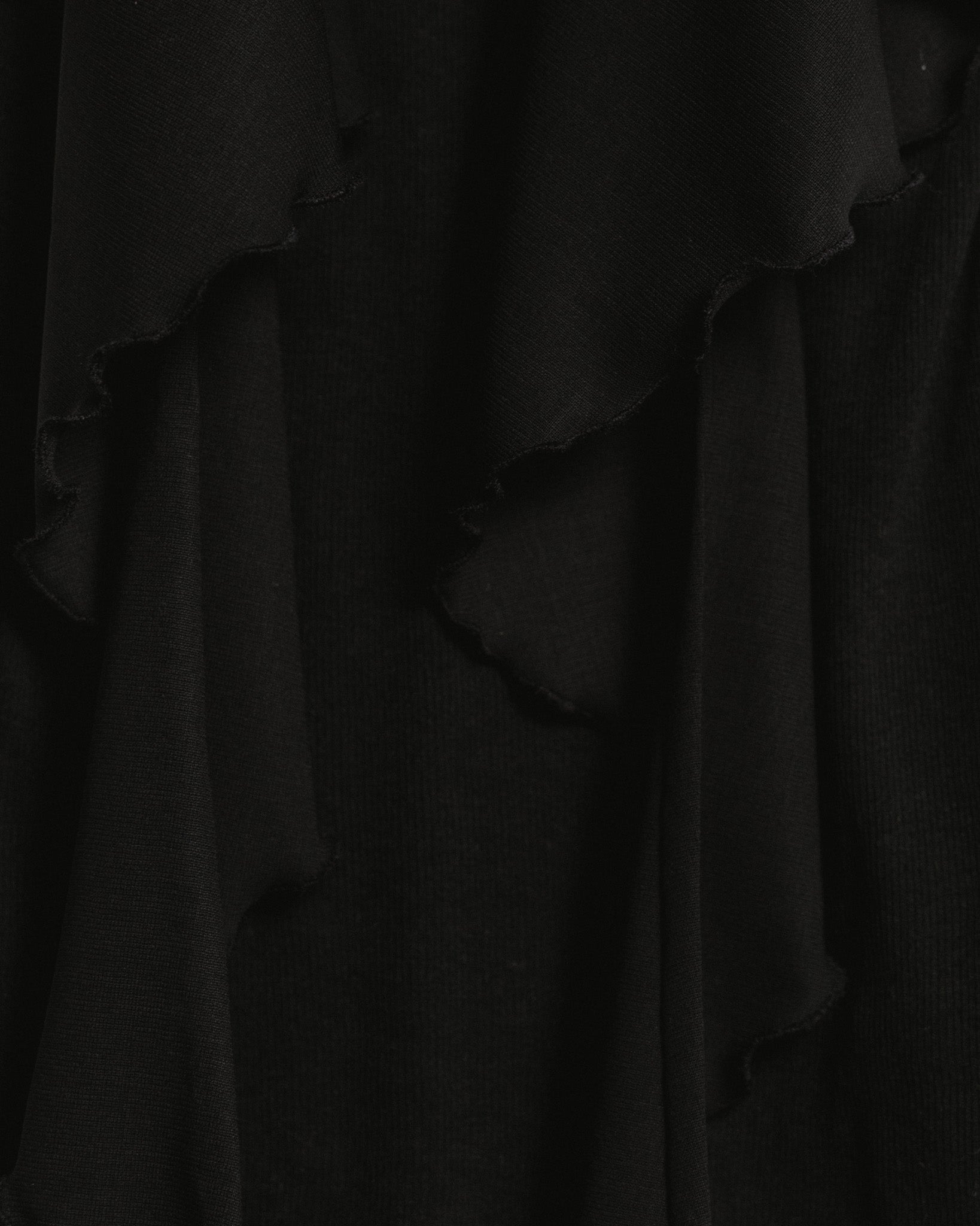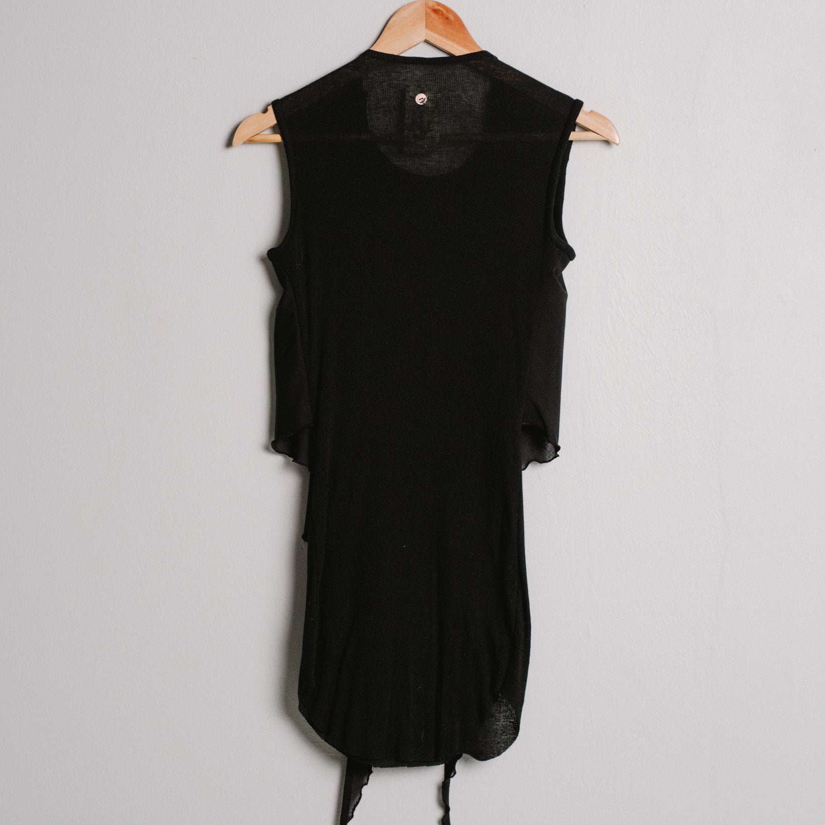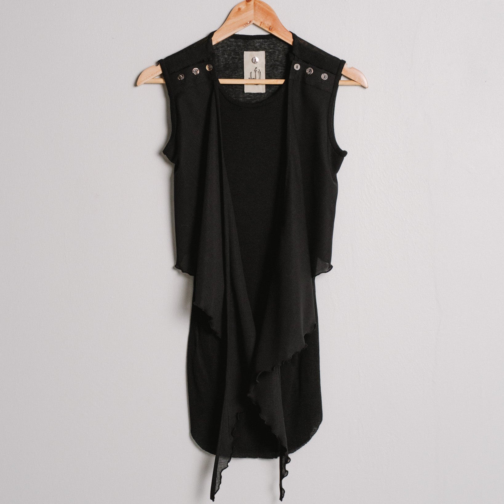 a snug fitting tank top made from soft, delicate cotton rib jersey and with a button closure on each shoulder. it also features two elongated wool voile panels in the front that can be adjusted through the shoulder buttons and either left hanging or freely tied around the body.