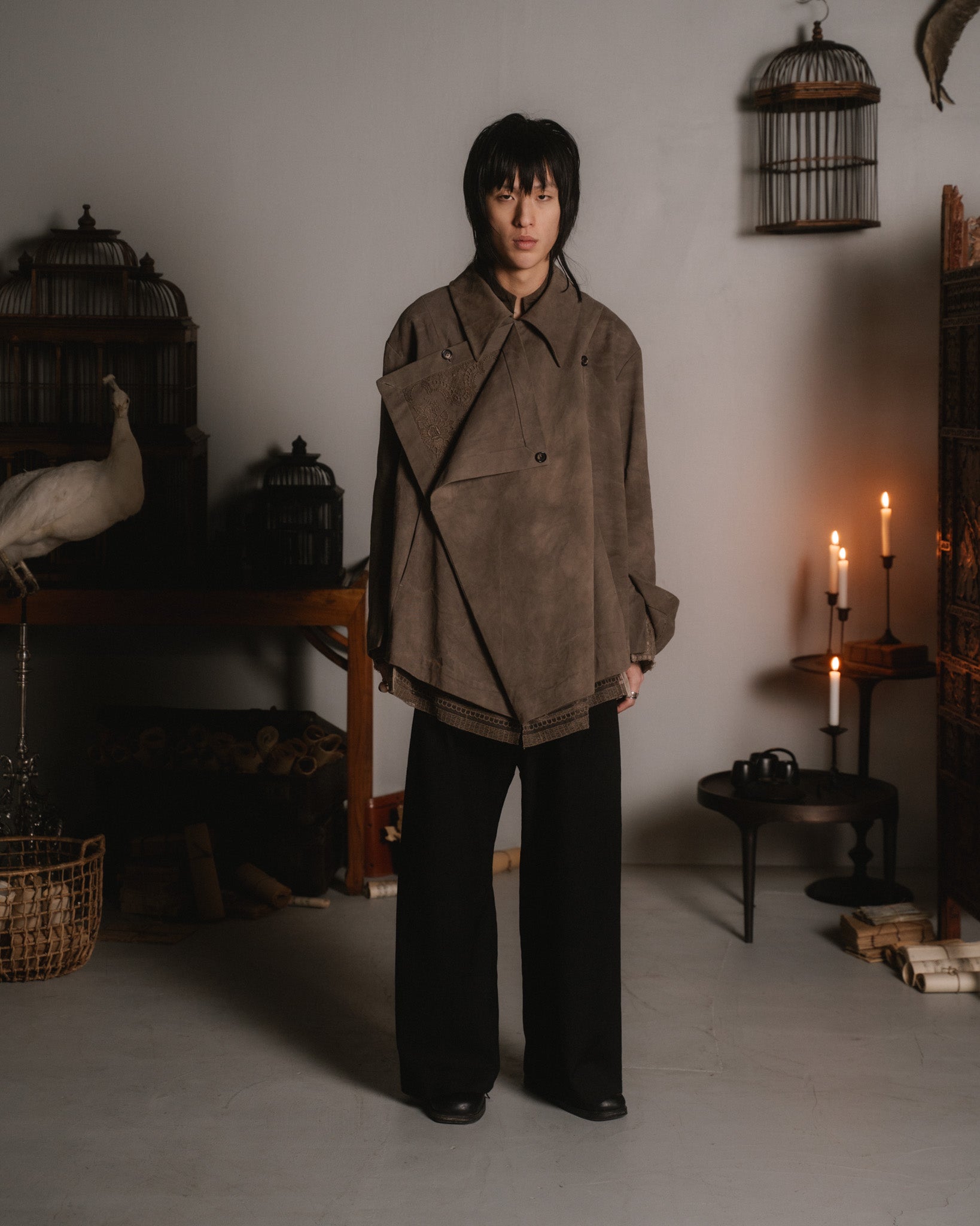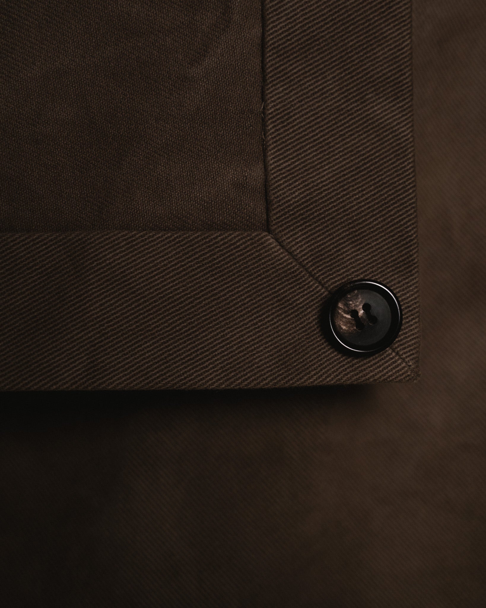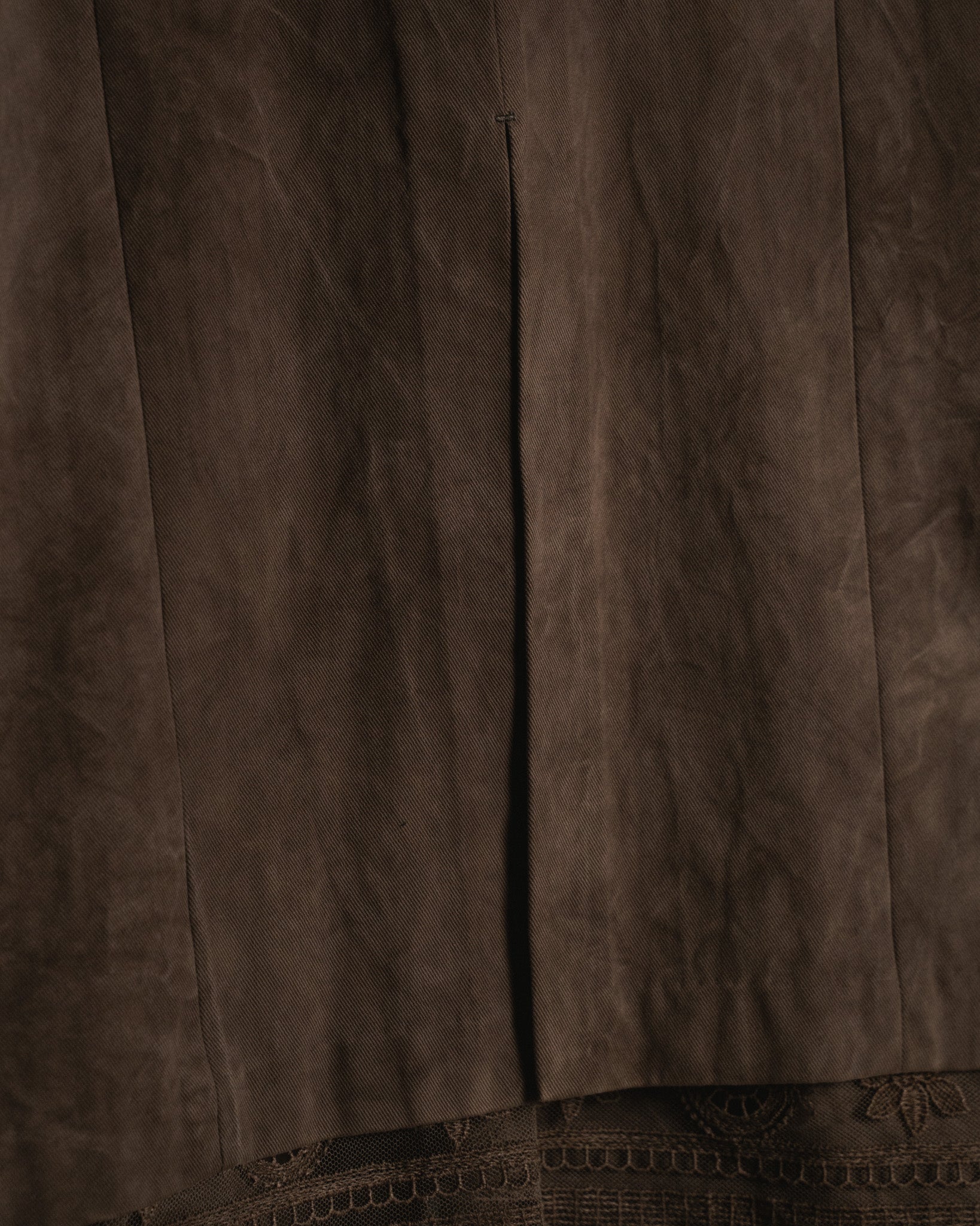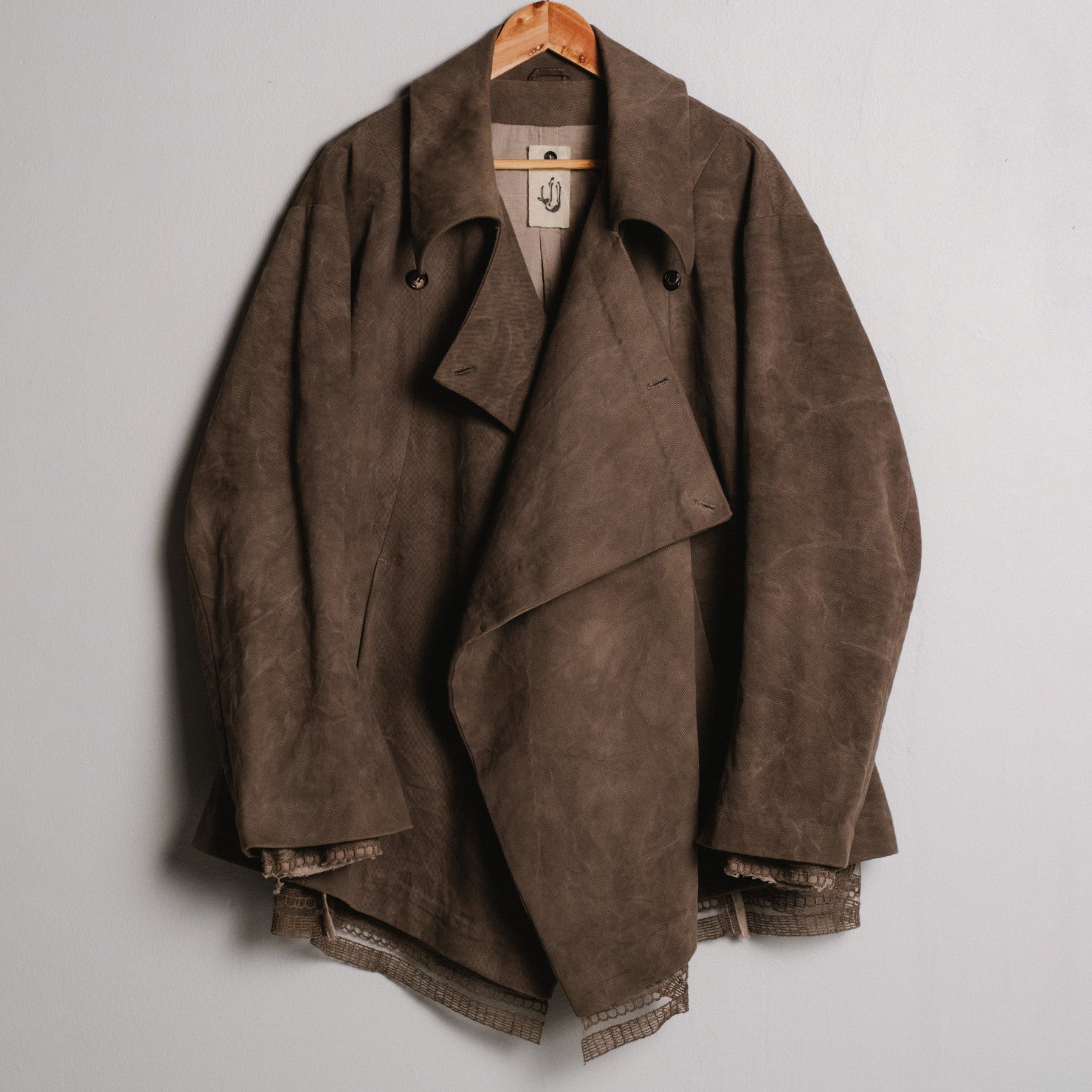 a loose fitting blazer with a slightly rounded collar and a large front overlap with two-button closure. it has two concealed side pockets, two welted inside pockets and a slit in the centre back. while the shell fabric is a sturdy heavy-weight cotton twill, the lining is a combination of fine plain weave cotton and vintage german cotton lace, that extends out from underneath the hemline. it can be further revealed by turning up the sleeves or unbuttoning a hidden flap on the left front panel. all fabrics have been naturally dyed by hand in the studio.