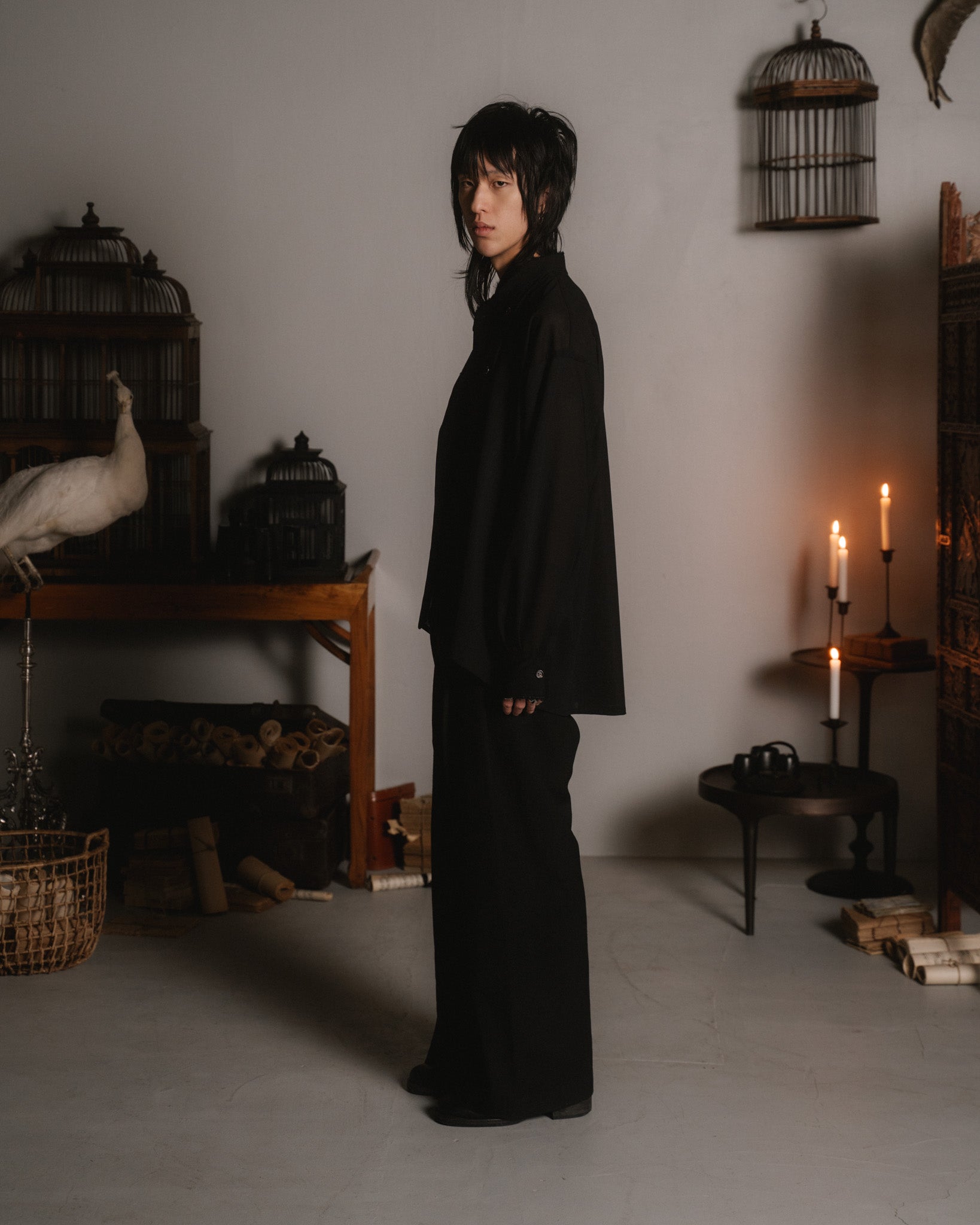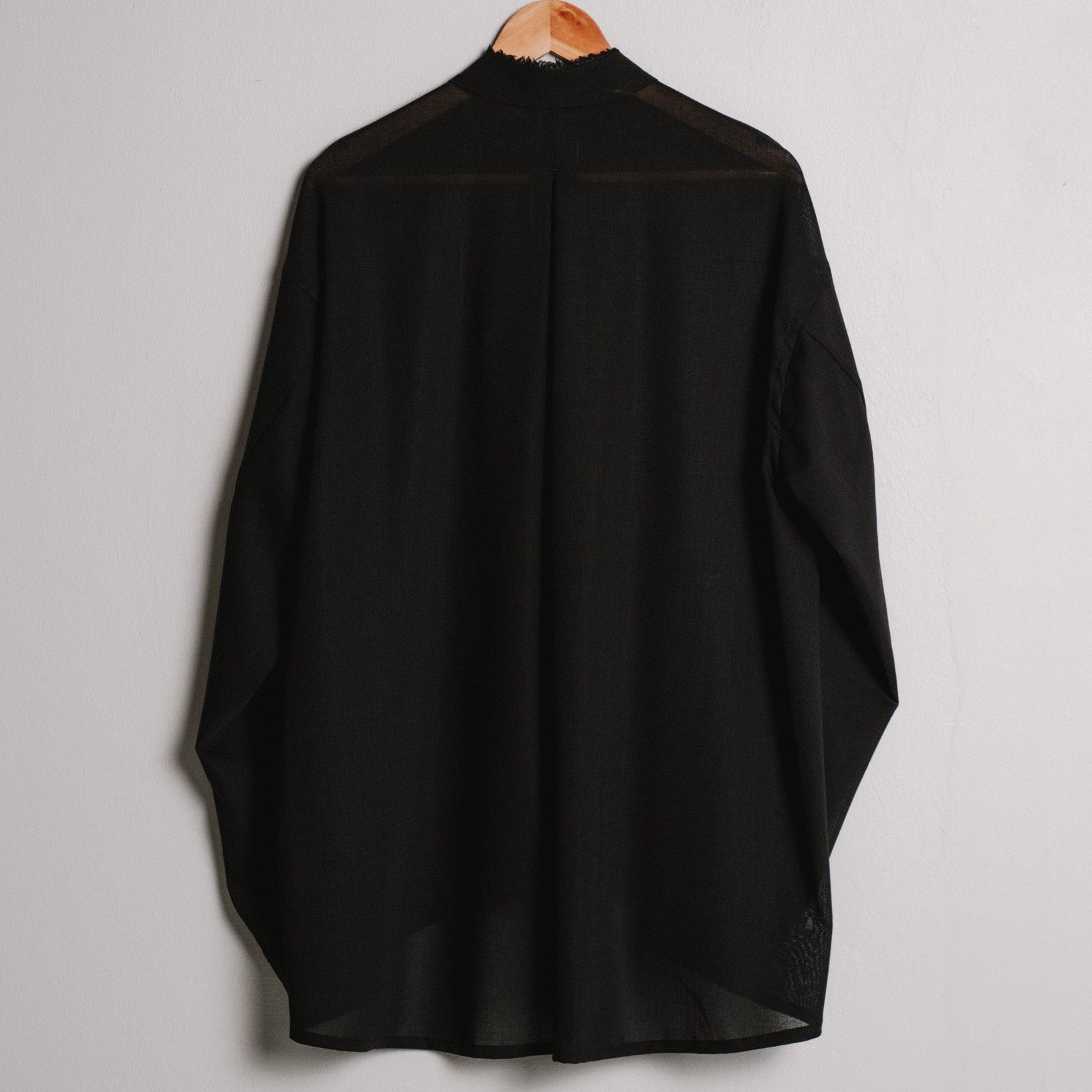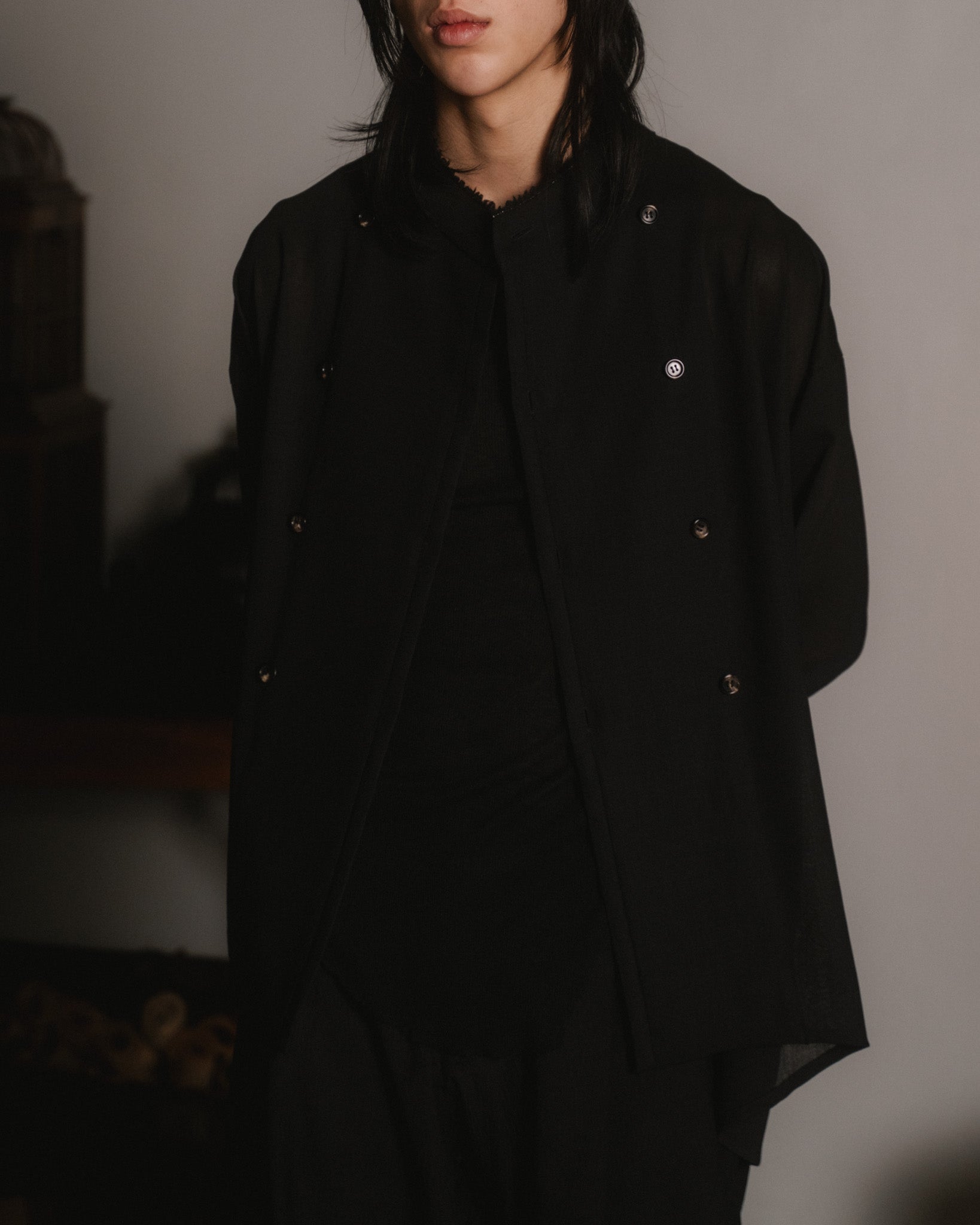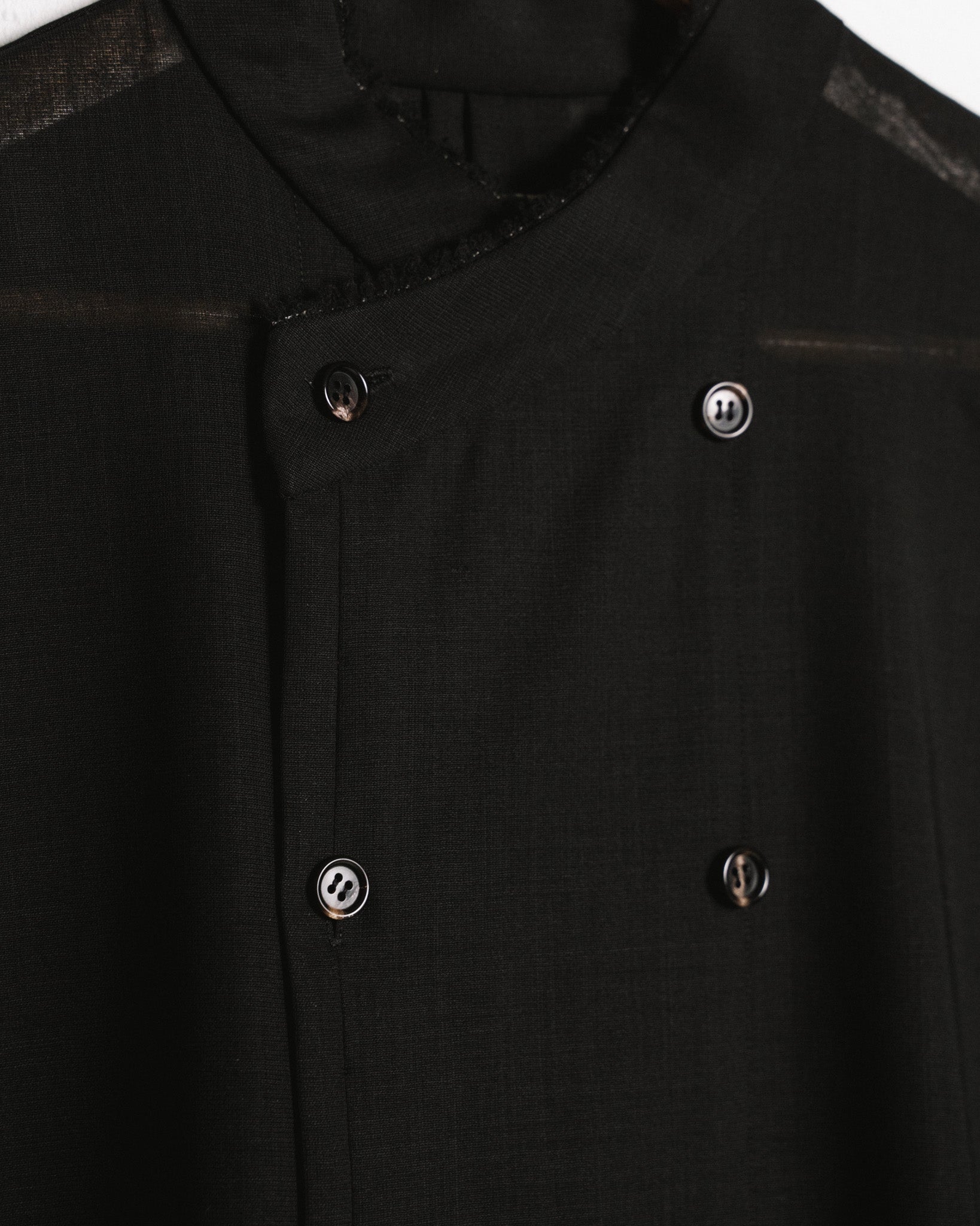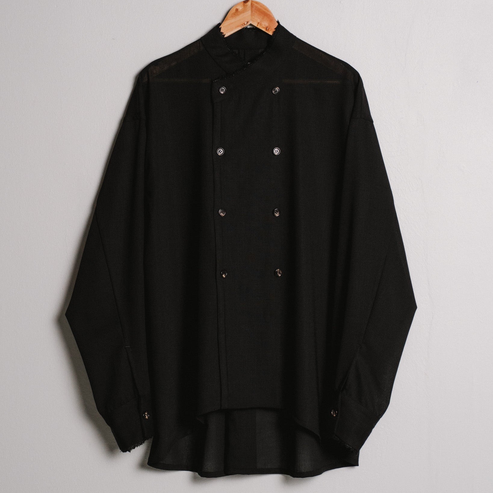 a loose fitting overshirt with double breasted button closure and inverted box pleat in the centre back. it is made from a semi-transparent wool voile with a soft, fluid drape. the fabric's selvedge has been saved while cutting and inserted into the collar and sleeve cuffs.