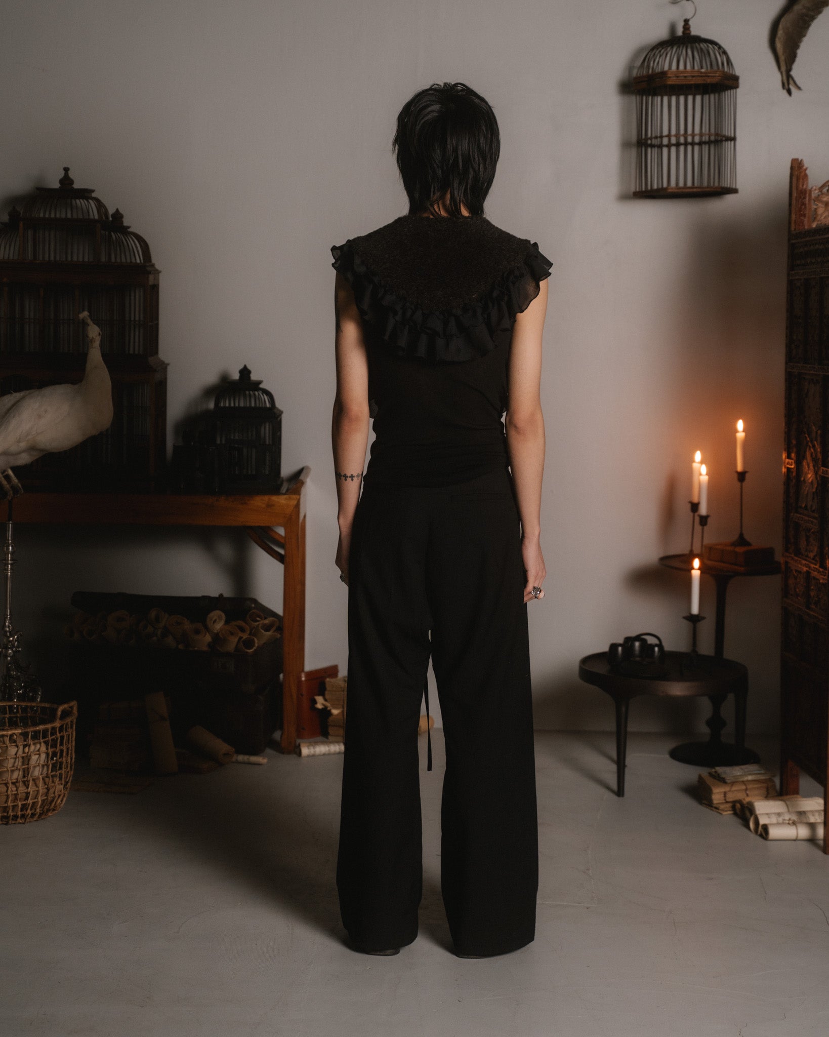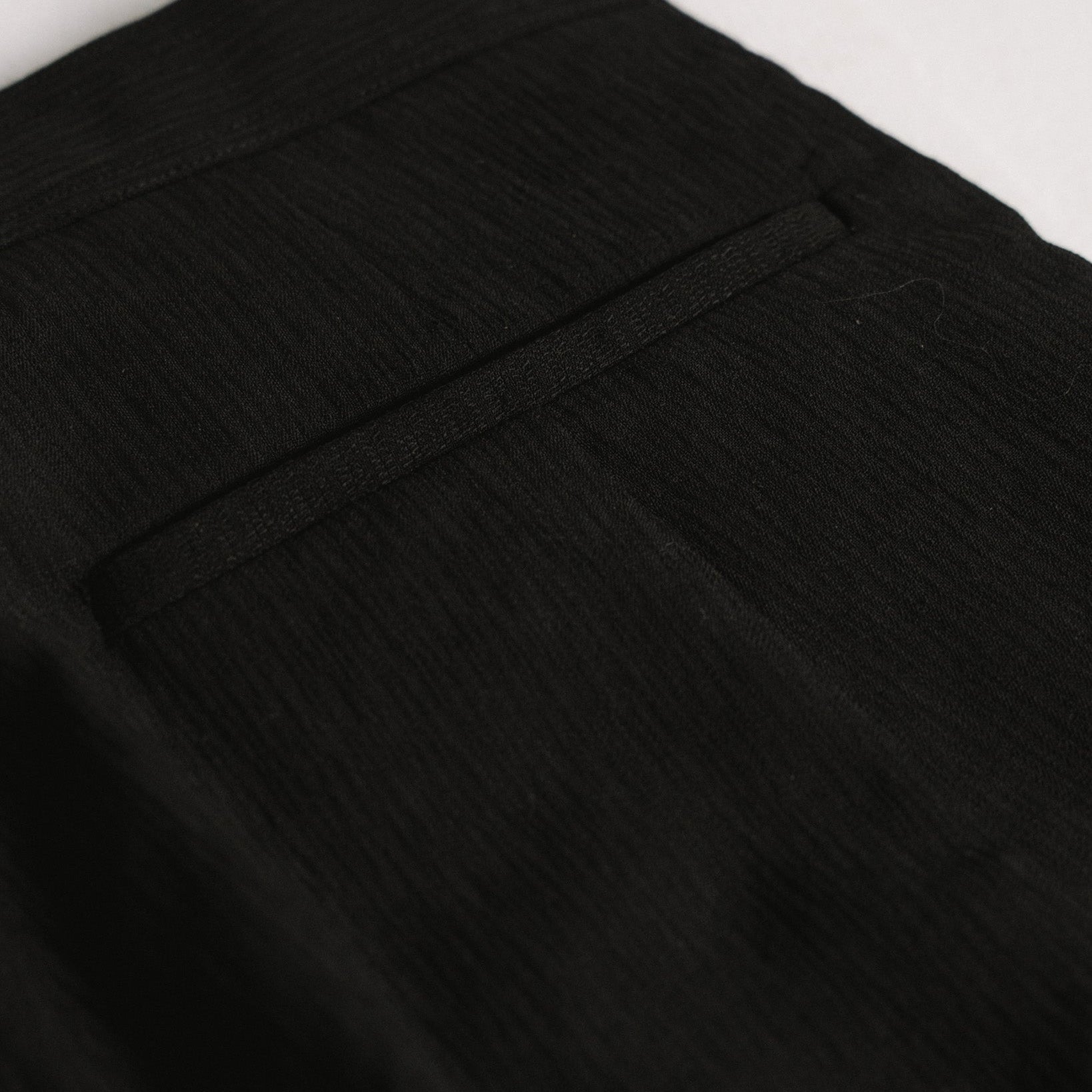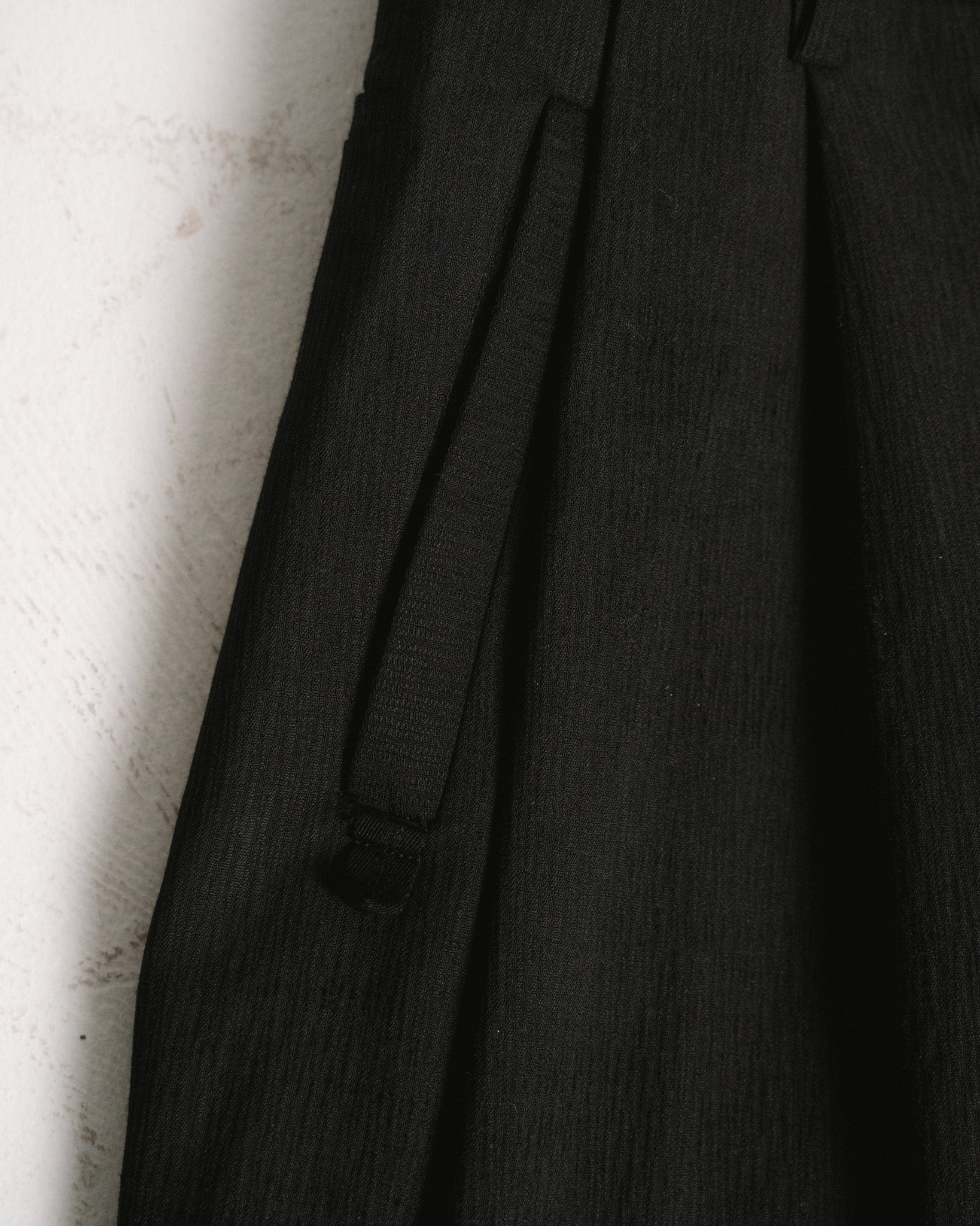 a wide legged trouser with a button fly, two large front pleats, two welt side pockets and two welt back pockets. a hook underneath the right side pocket opening can be used for attaching ornaments like the ribbon rose or the braided ribbon from the river stone brooch. the fabric is a medium weight, textured wool jacquard with a cool touch and fluid drape.