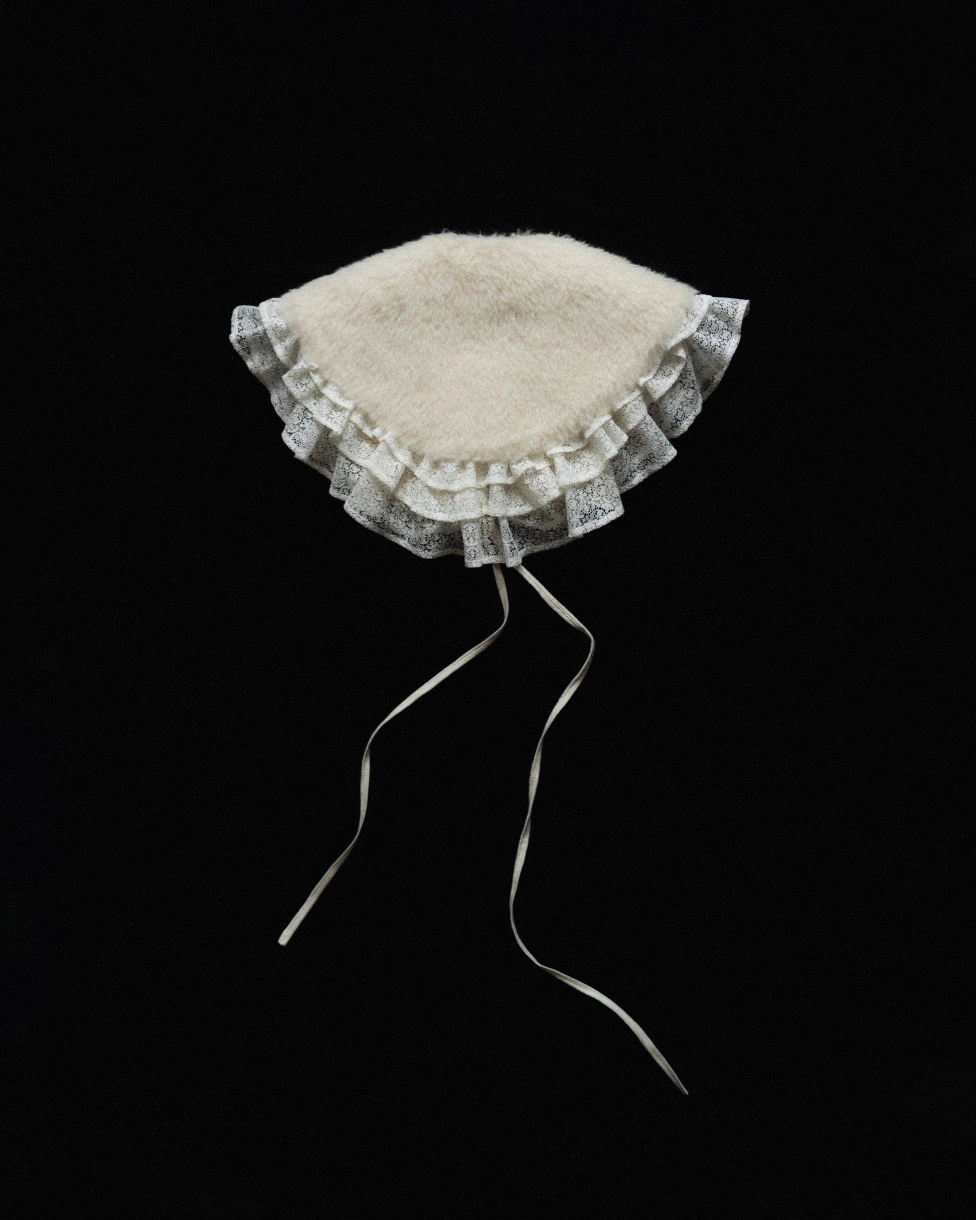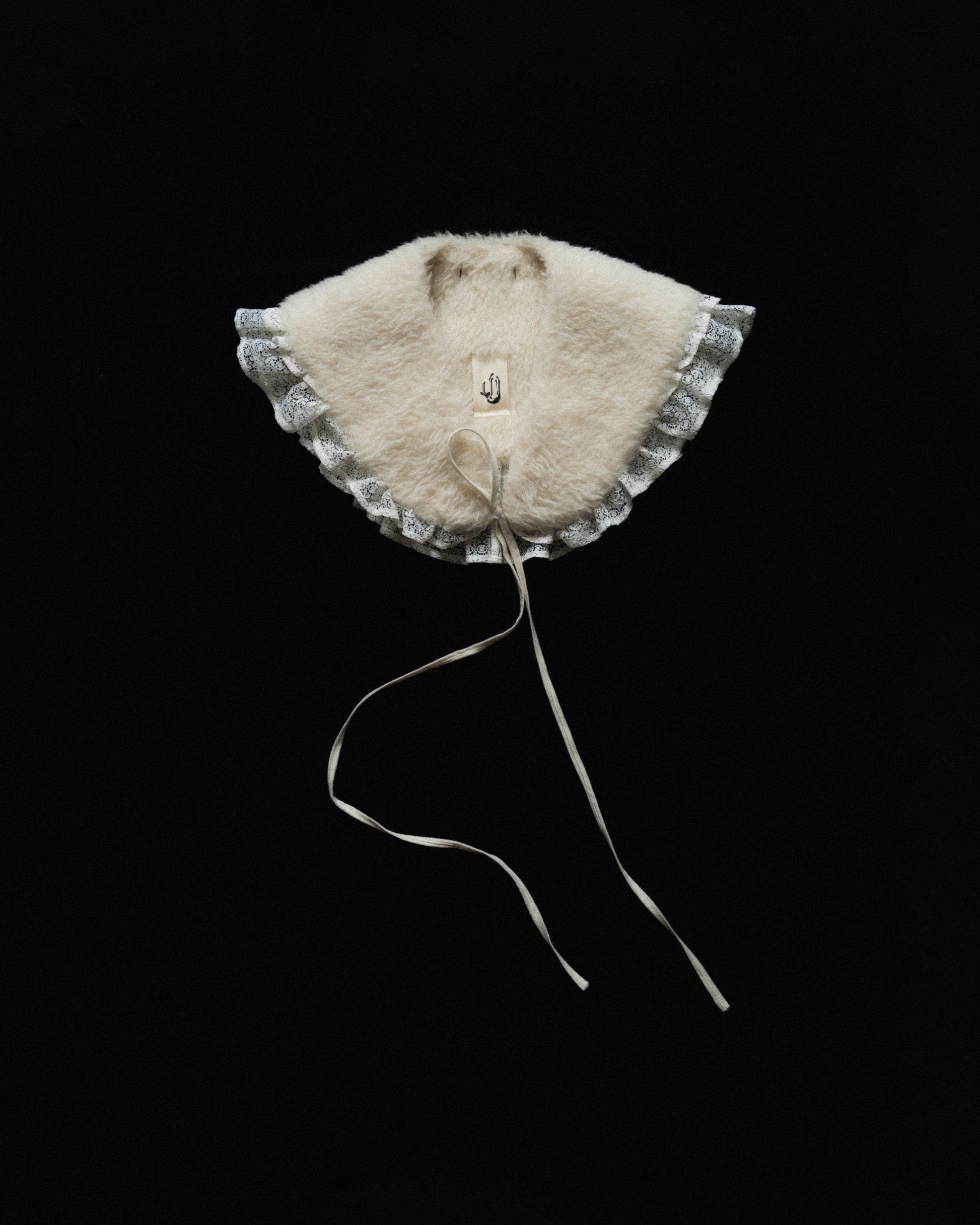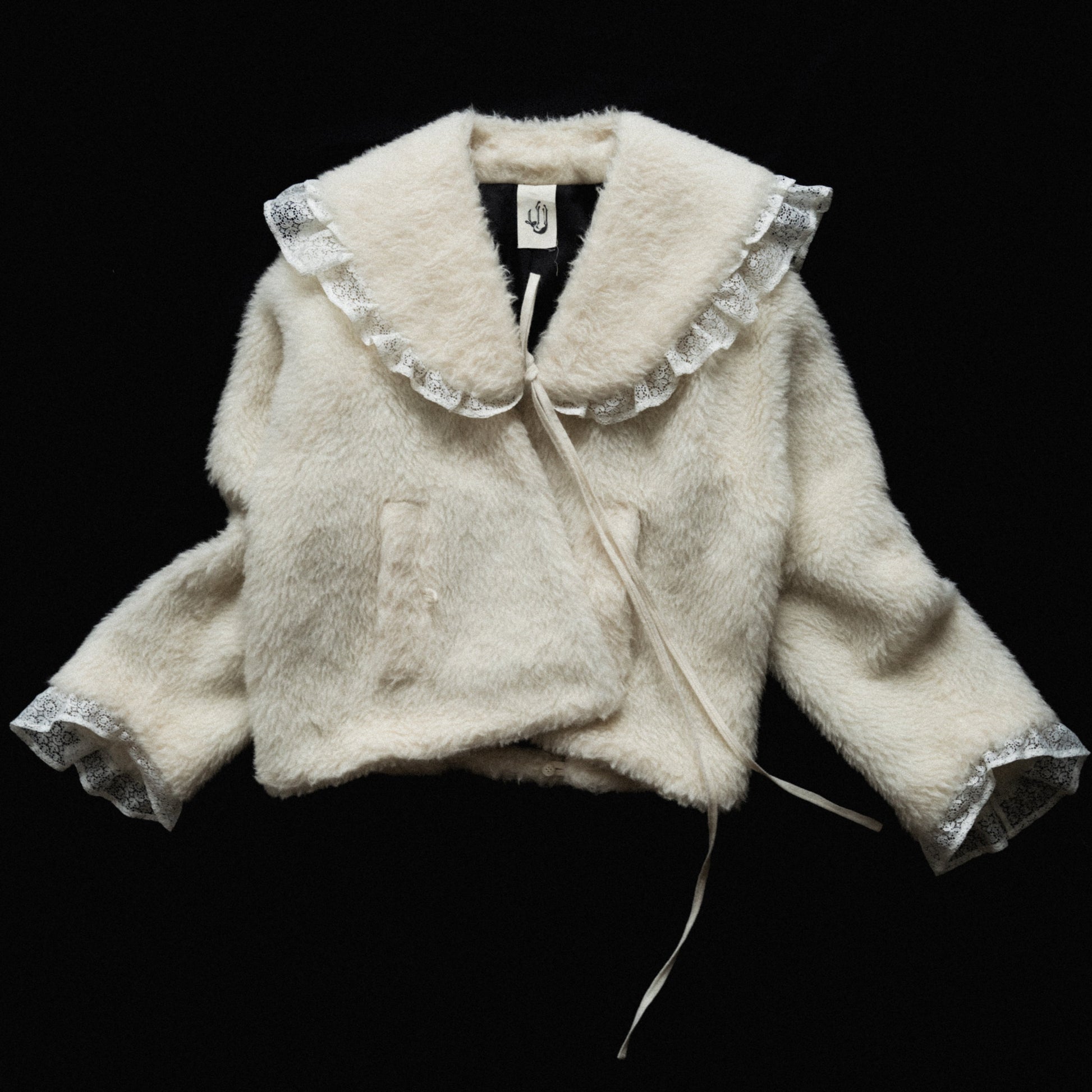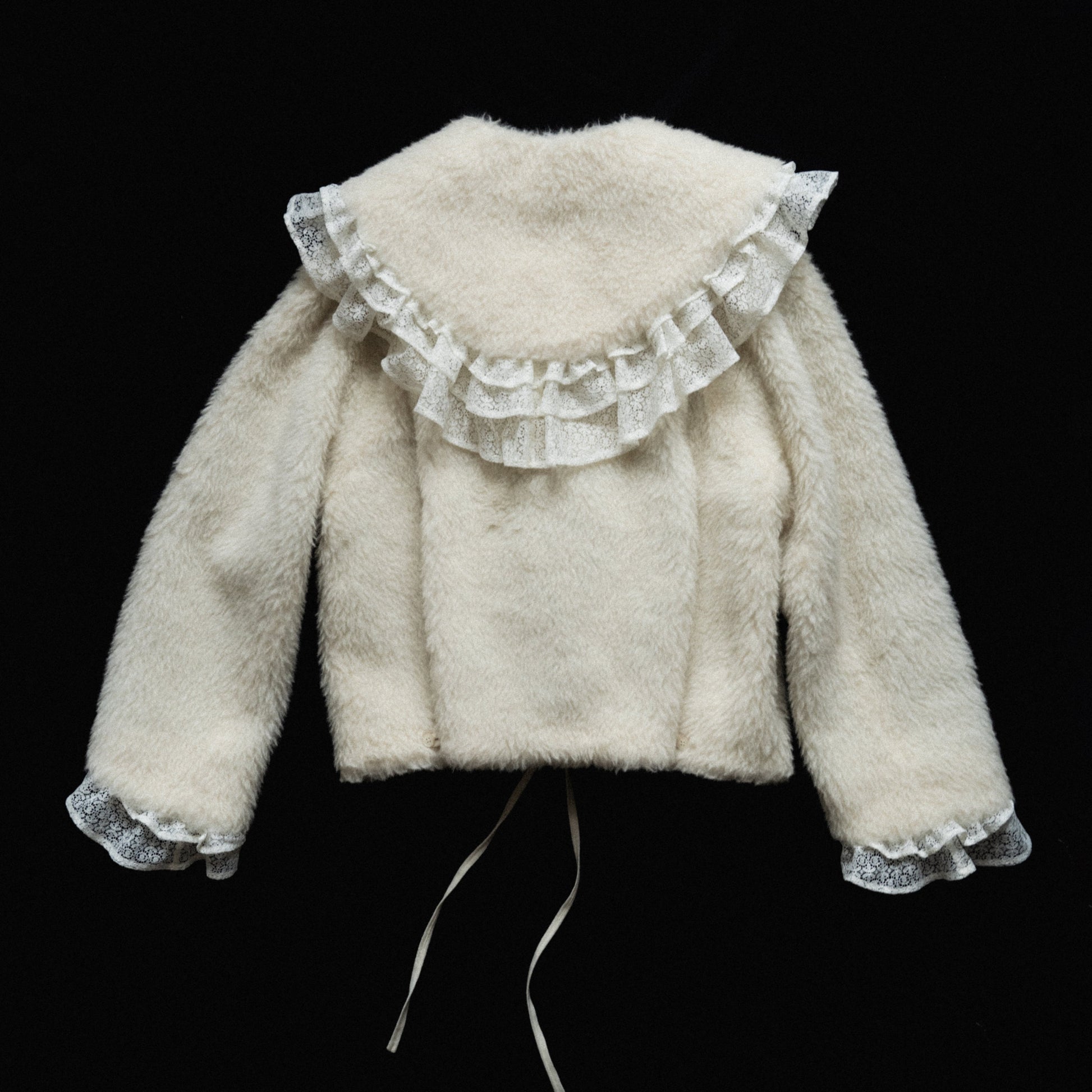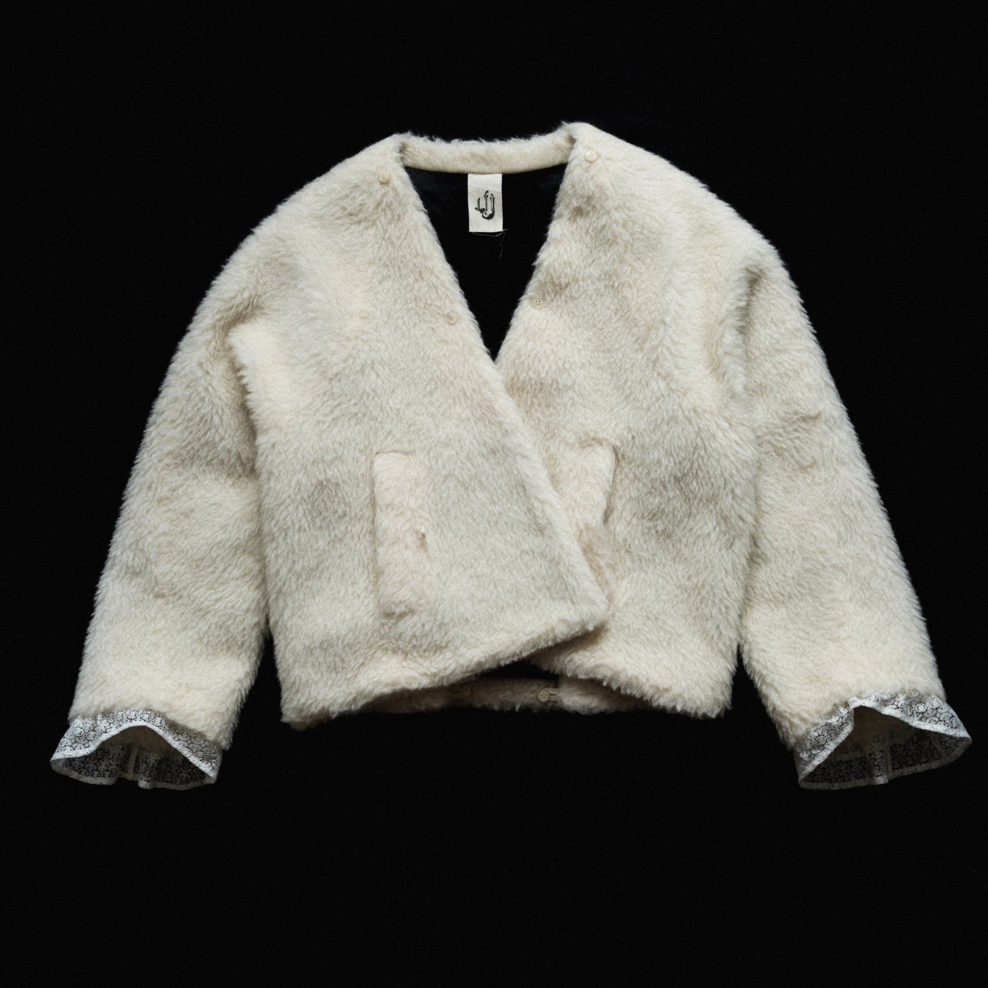 a jacket made from fuzzy icelandic wool, in the sheep's natural light color. the fit is slightly tapered towards the bottom and can be adjusted through buttoned pleats in the back. the front has an overlap with a button/ hook closure at the outside welt pockets. the jacket comes with a collar that can either be worn separately, or attached through a series of concealed buttons. both the edges of the collar as well as the sleeve opening are finished with cascading deadstock viscose lace ruffles.