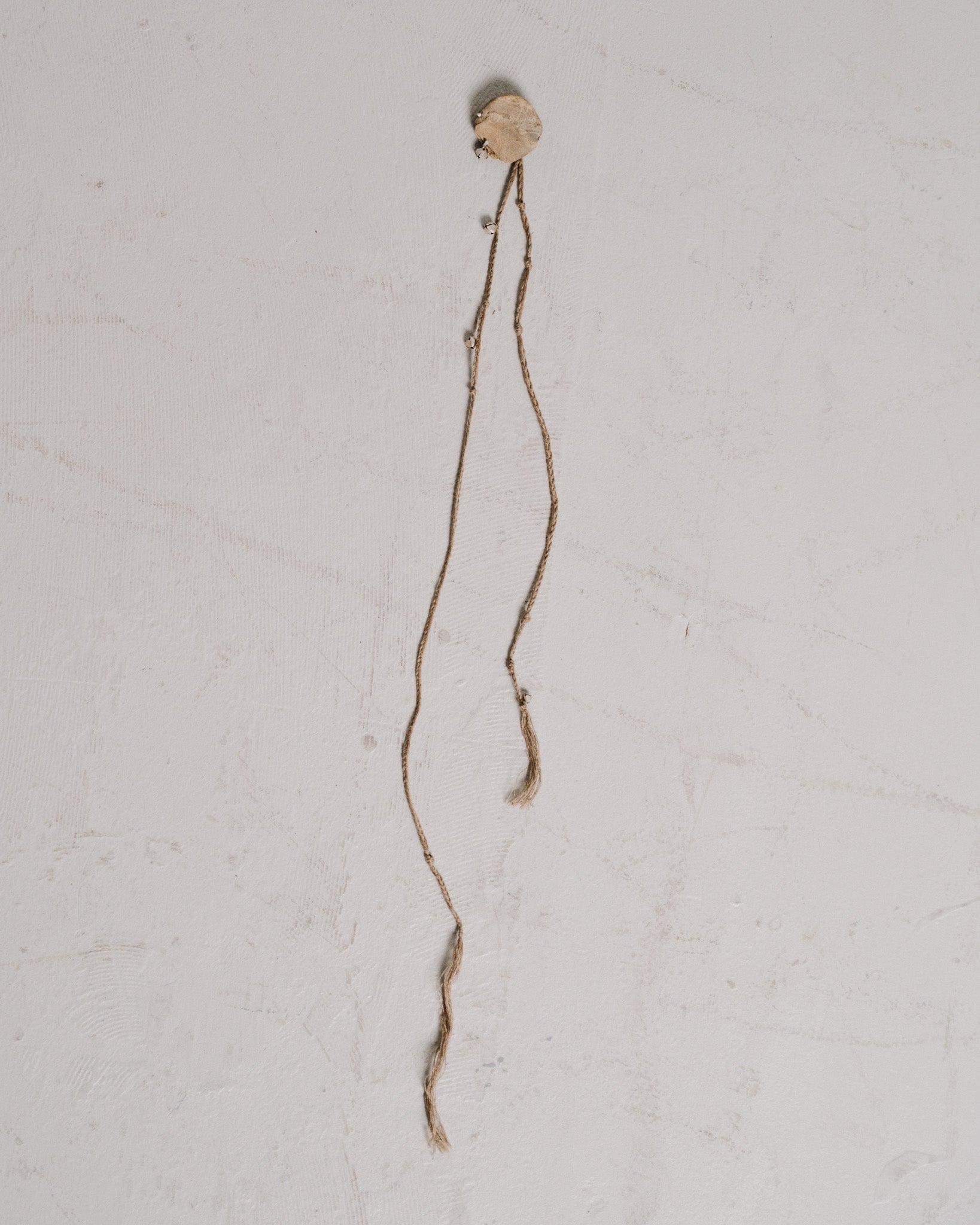 a found river stone from southern germany, set in .925 sterling silver and made into a brooch with a silver bell. a hook on the back allows for a hand dyed and braided linen ribbon with more bells to be attached.