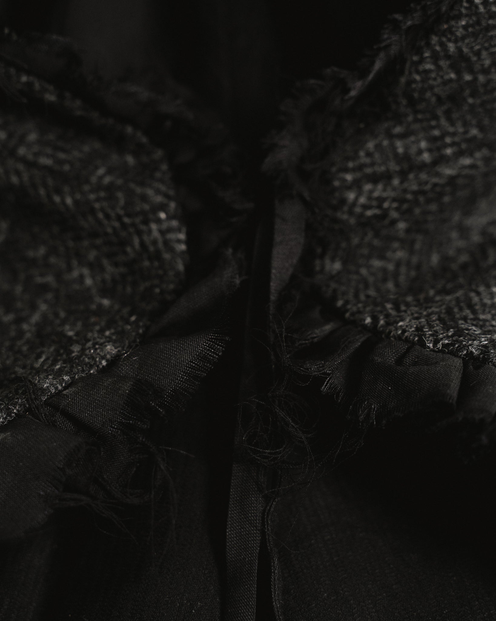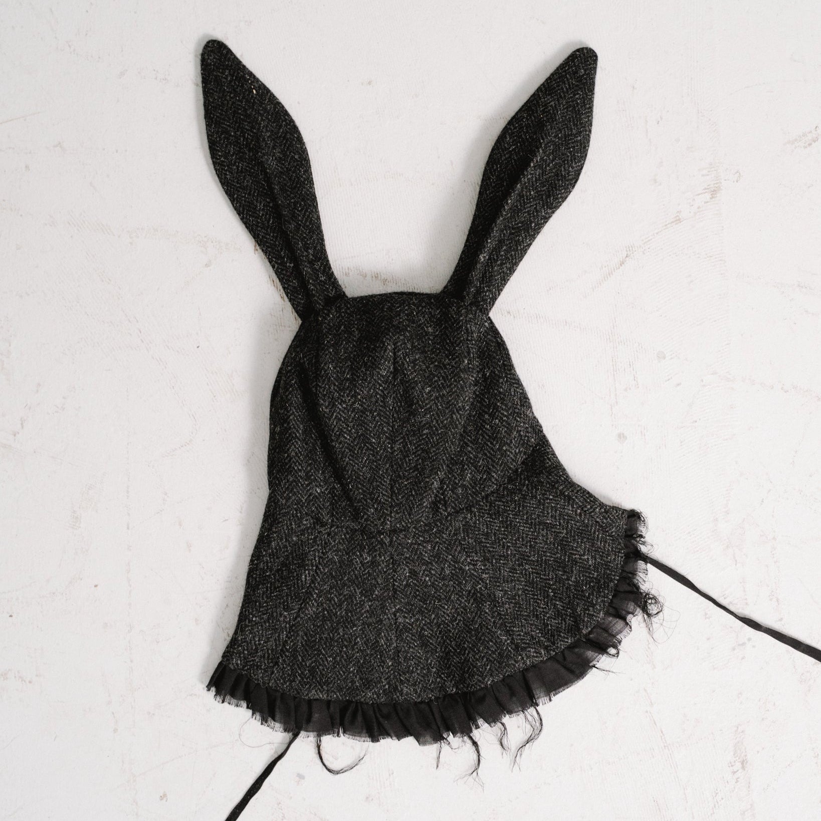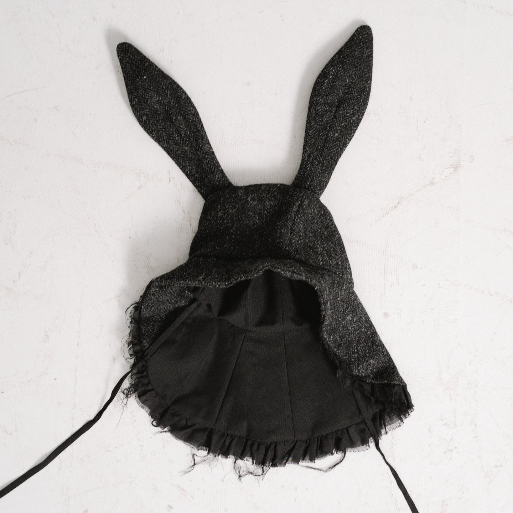 a hat with wire-enforced bunny ears, made from dark grey Harris Tweed™ wool herringbone. it has a short brim in the front that gets longer in the back and is finished with frayed wool voile ruffles. the hat can be worn open or closed with a ribbon under the chin.