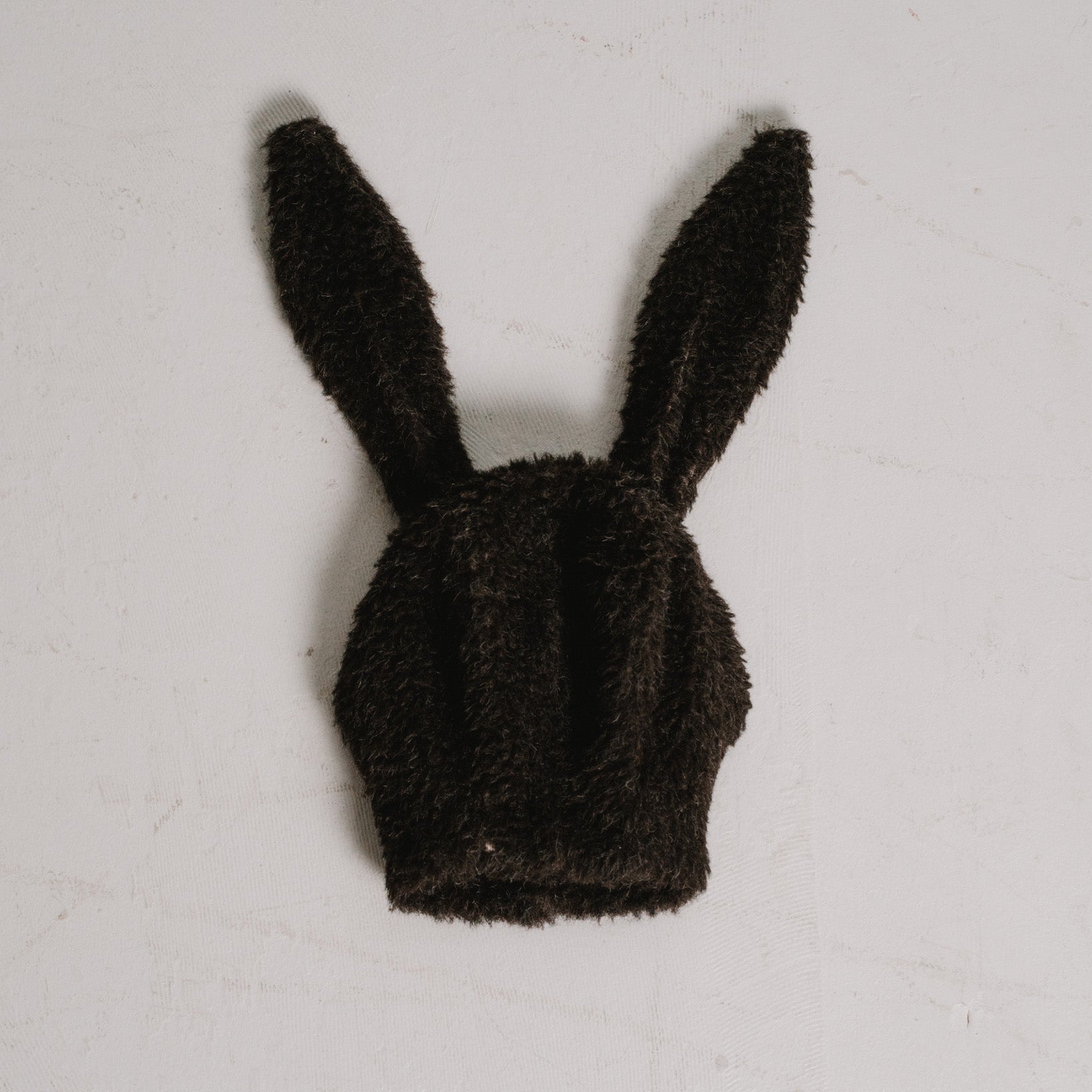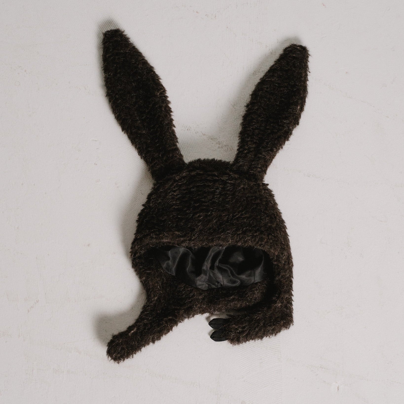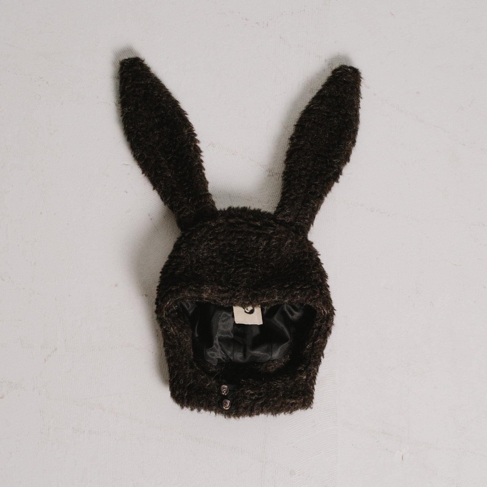 a cap made from fuzzy icelandic sheep wool, in the sheep's natural brown color. it has two signature bunny ears on top and a button/ hook closure underneath the chin.