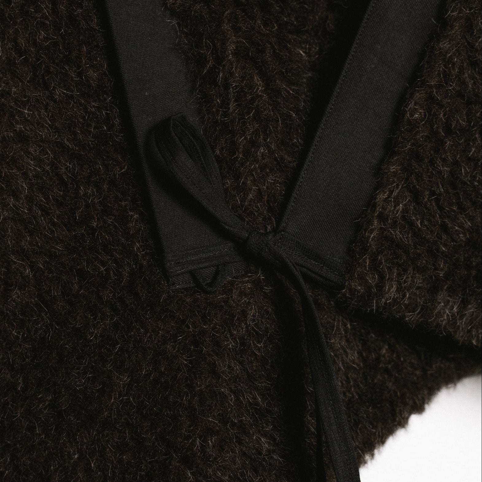 an oversized vest that overlaps in the shorter front to allow for a ribbon closure, and separates towards a widening gap in the elongated back. it is made from fuzzy icelandic wool, in the sheep's natural brown color. the left front and both back panels have a sturdy, dry cotton/wool trim around the edges. besides an inside patch pocket, the vest features two large welted outside pockets. on the right one also is a small hook for attaching separate ornaments, like the ribbon rose or the braided ribbon from the river stone brooch.